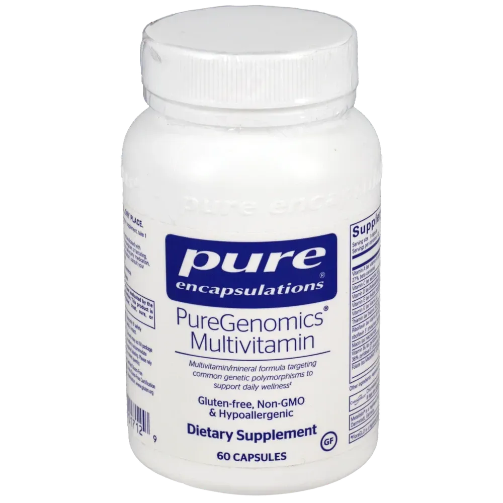 Additional benefits of Pure Encapsulations PureGenomics Multivitamin may also include healthy cognitive function, macular and retinal health, support for genetic polymorphisms, and genetic variations in the methylation pathway.